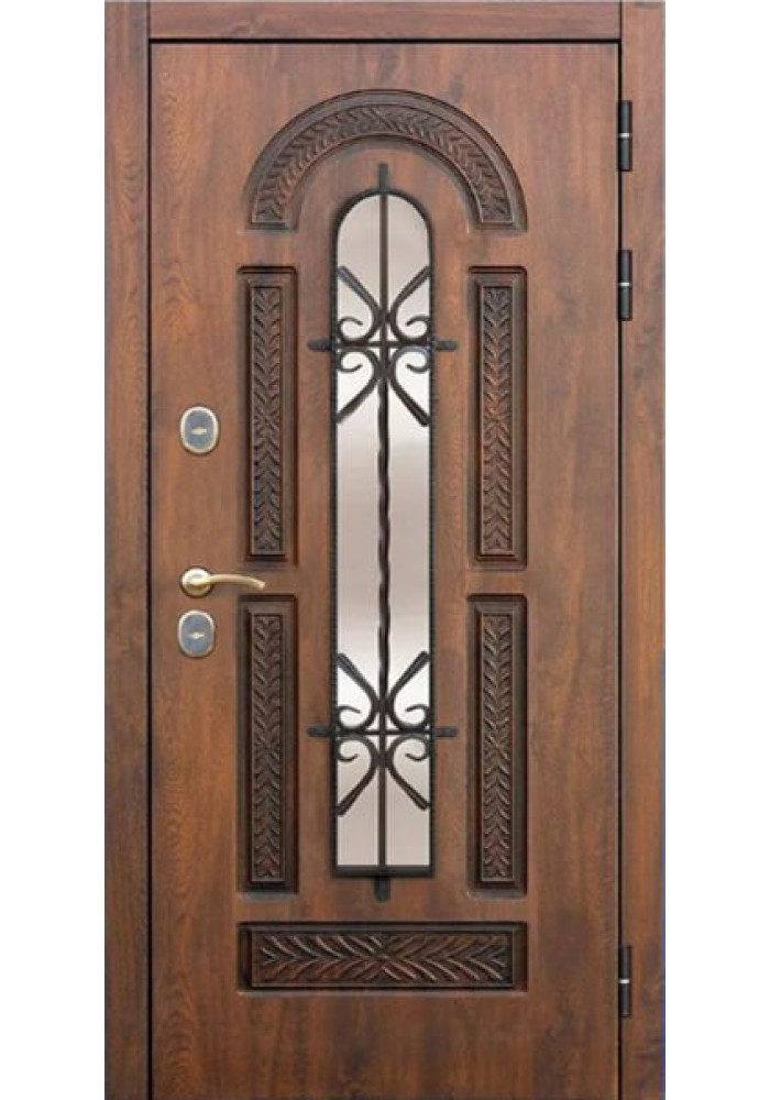 Отделка снаружи: Лист стали 1.2мм + МДФ панель 12мм ламинированная пленкой Винорит (Израиль) с патиной , цвет Грецкий орех» с патиной Стеклопакет, Ковка